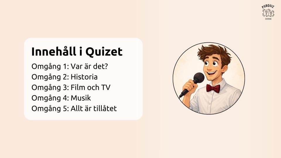 De rätta svaren finns i bildspelet efter varje omgång, så du bestämmer själv om du vill ha en quizmaster eller om alla ska delta i quizet. Vill du bli en grym quizmaster? Kolla in våra tips för att presentera ett pubquiz!