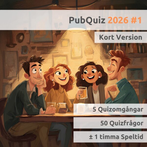 Redo för en rolig quizkväll? PubQuiz 2026 #2 bjuder på 70 quizfrågor fördelade på 7 utmanande omgångar. Här får ni teman som tid, musik, sport, film och tv och mycket mer. Perfekt för en festlig kväll med vänner, familj eller kollegor!