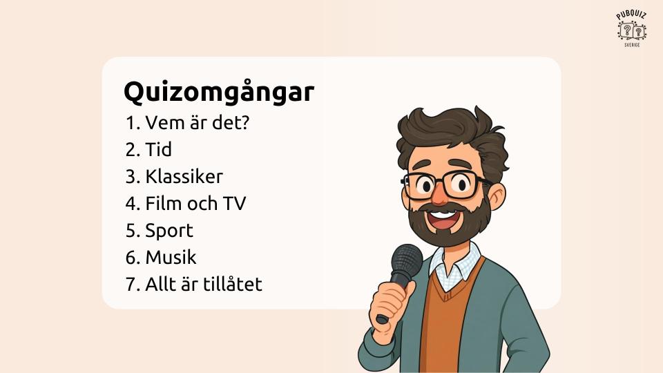 De rätta svaren finns i bildspelet efter varje omgång, så du bestämmer själv om du vill ha en quizmaster eller om alla ska delta i quizet. Vill du bli en grym quizmaster? Kolla in våra tips för att presentera ett pubquiz!