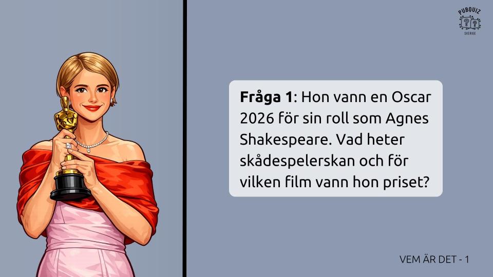 - Omgång 1: Vem är det? (Bildomgång: Känner du igen skådespelarna och vet du vad de vann en Oscar för?)