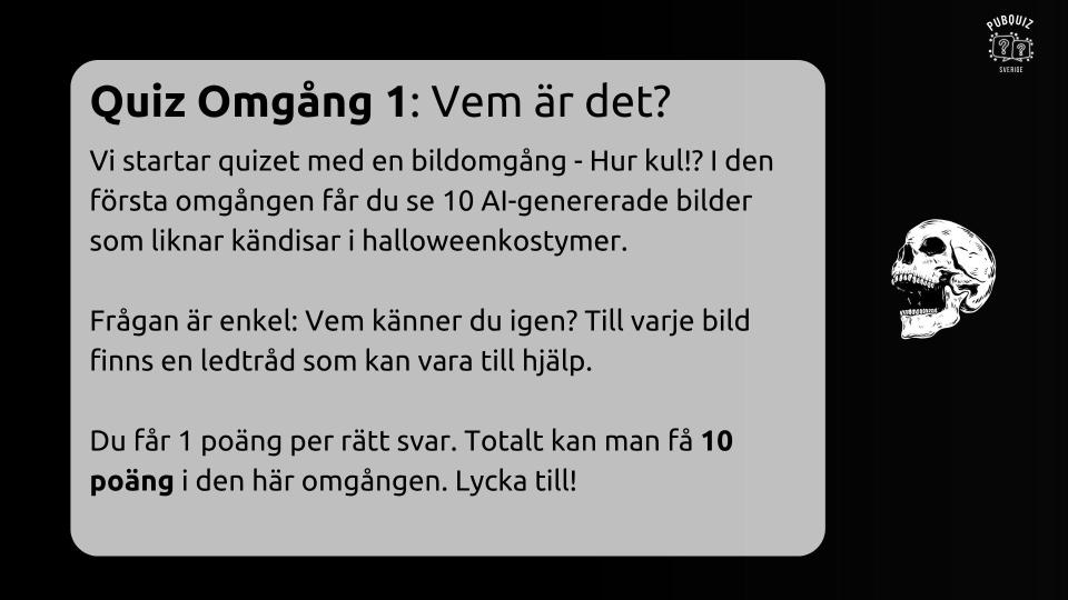 De rätta svaren finns i bildspelet efter varje omgång, så du bestämmer själv om du vill ha en quizmaster eller om alla ska delta i quizet. Vill du bli en grym quizmaster? Kolla in våra tips för att presentera ett pubquiz!