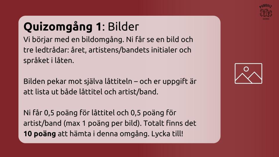 - Omgång 1: Bilder (Bildomgång: Gissar ni rätt låttitel och artist med hjälp av bilder och ledtrådar?)