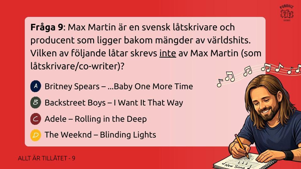 De rätta svaren finns i bildspelet efter varje omgång, så du bestämmer själv om du vill ha en quizmaster eller om alla ska delta i quizet. Vill du bli en grym quizmaster? Kolla in våra tips för att presentera ett pubquiz!