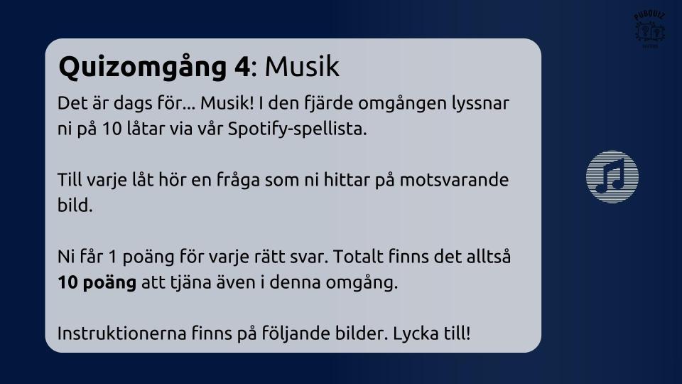 - Omgång 4: Musik (10 låtar från vår Spotify spellista med tillhörande frågor)
